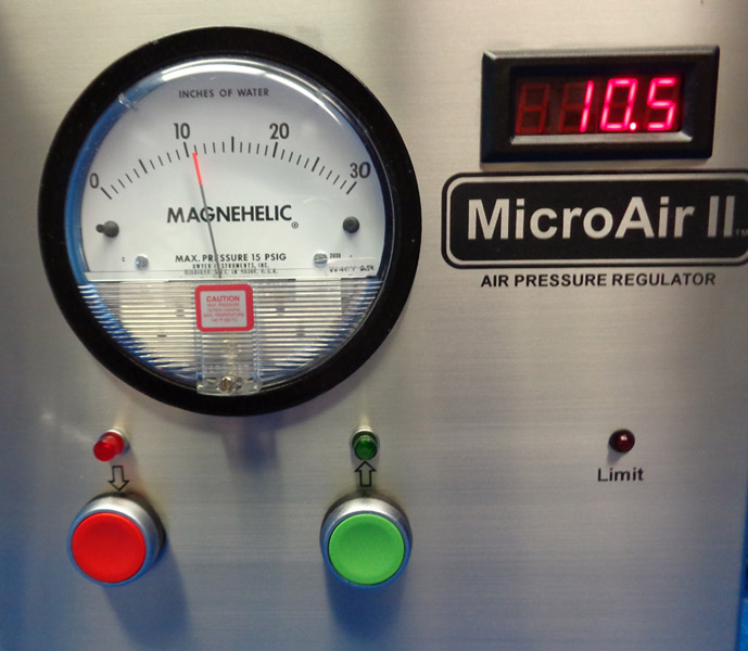All units come with a 4 ½” magnehelic meter for pressure readout—optional digital display must be ordered at the time of purchase. A range must be specified on your purchase order when ordering a MicroAir I, MicroAir II and MicroAir IV single channel model. On all Dual, 3-channel and 4-channel MultiAir units a range must be specified for each channel.